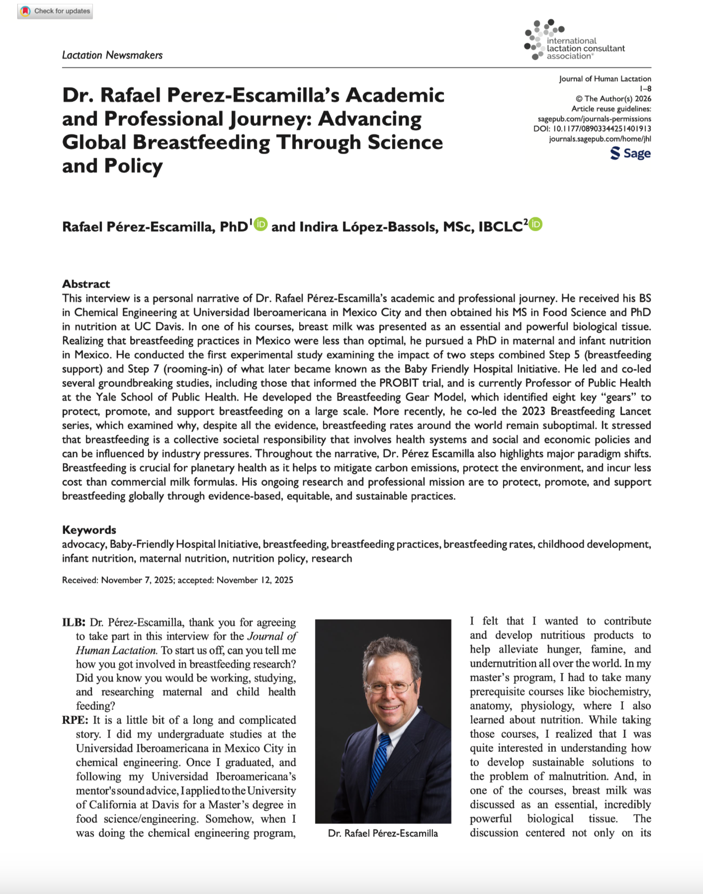 Journal of Human Lactation published 19 of February 2026This interview is a personal narrative of Dr. Rafael Pérez-Escamilla’s academic and professional journey. He conducted the first experimental study examining the impact of two steps combined Step 5 (breastfeeding support) and Step 7 (rooming-in) of what later became known as the Baby Friendly Hospital Initiative. He led and co-led several groundbreaking studies, including those that informed the PROBIT trial, and is currently Professor of Public Health at the Yale School of Public Health. He developed the Breastfeeding Gear Model, which identified eight key “gears” to protect, promote, and support breastfeeding on a large scale.
